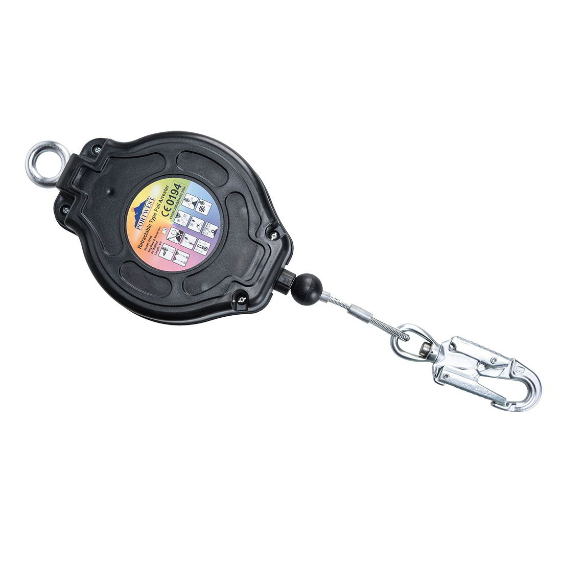 Αυτό το μπλοκ σύλληψης πτώσης αποτελείται από ένα σχοινί διάσωσης από συρματόσχοινο το οποίο είναι αποθηκευμένο σε ένα καρούλι μέσα σε ένα προστατευτικό περίβλημα. Το καρούλι είναι βασισμένο σε ελατήριο ώστε να αναδιπλώνεται το σκοινί διάσωσης. Το καρούλι ενσωματώνει ένα μηχανισμό αδρανείας ο οποίος επιτρέπει το σκοινί διάσωσης να μαζεύεται αυτόματα για να προσαρμόζεται στις κινήσεις του σώματος του χρήστη. Περιλαμβάνει επίσης έναν περιστρεφόμενο γάντζο με διπλό διακόπτη ασφαλείας και δείκτη πτώσης.