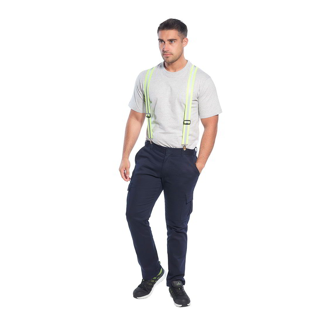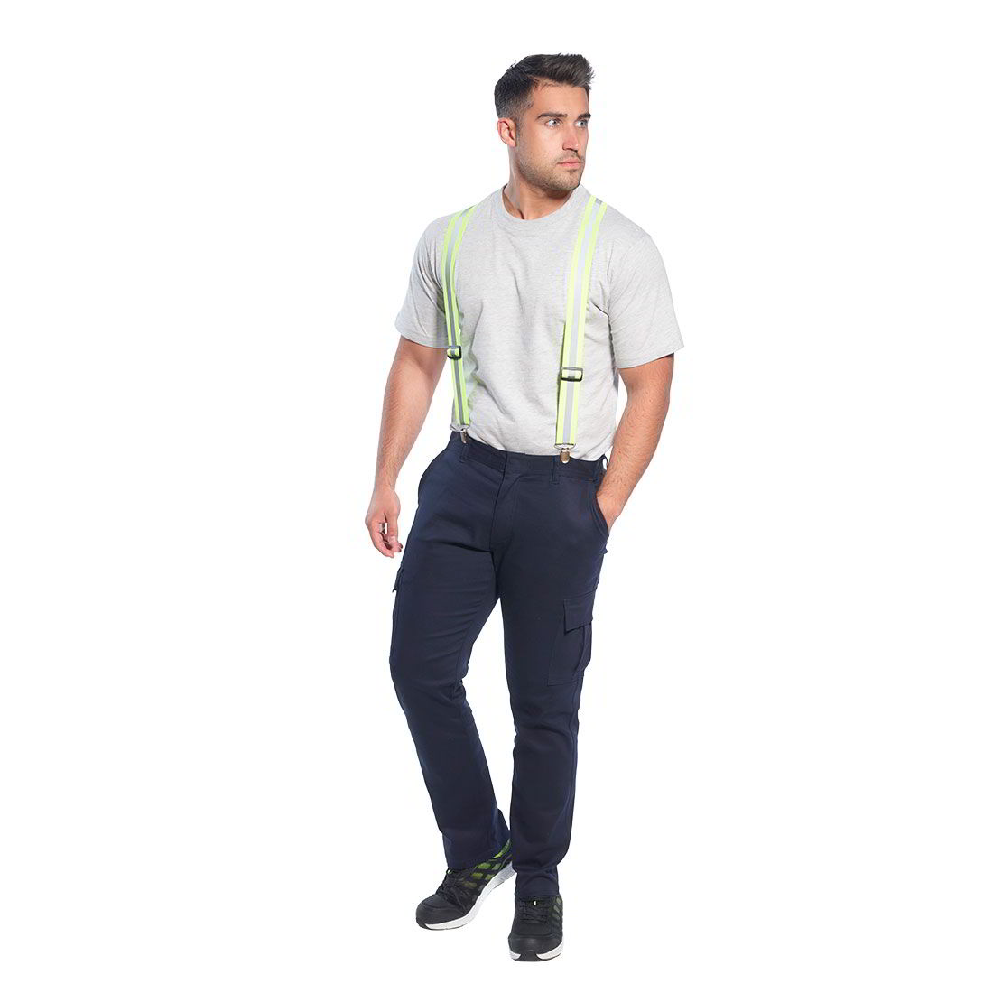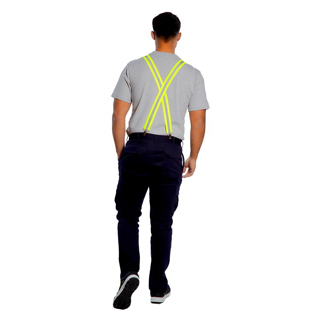 Ρυθμιζόμενα ελαστικές τιράντες με τέσσερα σημεία στερέωσης κλιπ για ασφαλή τοποθέτηση σε όλα τα παντελόνια. Χρησιμοποιώντας χρώμα υψηλής ορατότητας και ανακλαστική εκτύπωση για εξαιρετική ορατότητα.